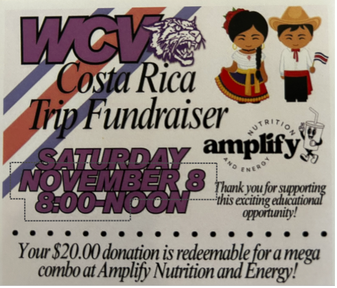 A huge ¡Gracias! To Amplify Nutrition and Energy for supporting the Costa Rica travelers! From 8:00 am until noon on Saturday, November 8, a portion of each sale will be donated to our students. If you would like to purchase a Mega combo for $20, please contact Renee Pepper, trip coordinator, at rpepper@wcv.k12.ia.us. #amplifynutritionandenergy #WCVHS